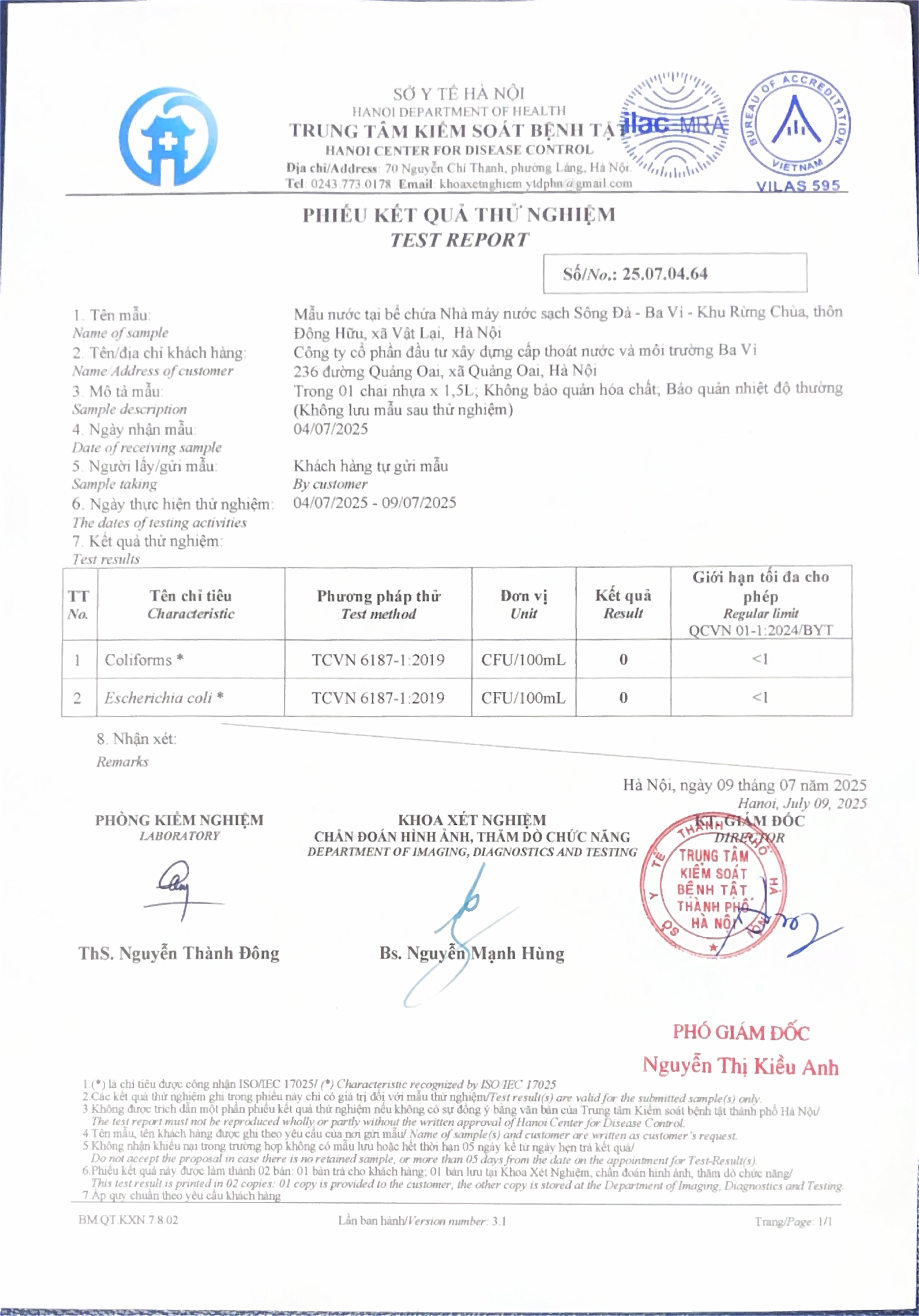 Trang Chủ Chất lượng nước Kết quả thử nghiệm nước Tháng 07/2025