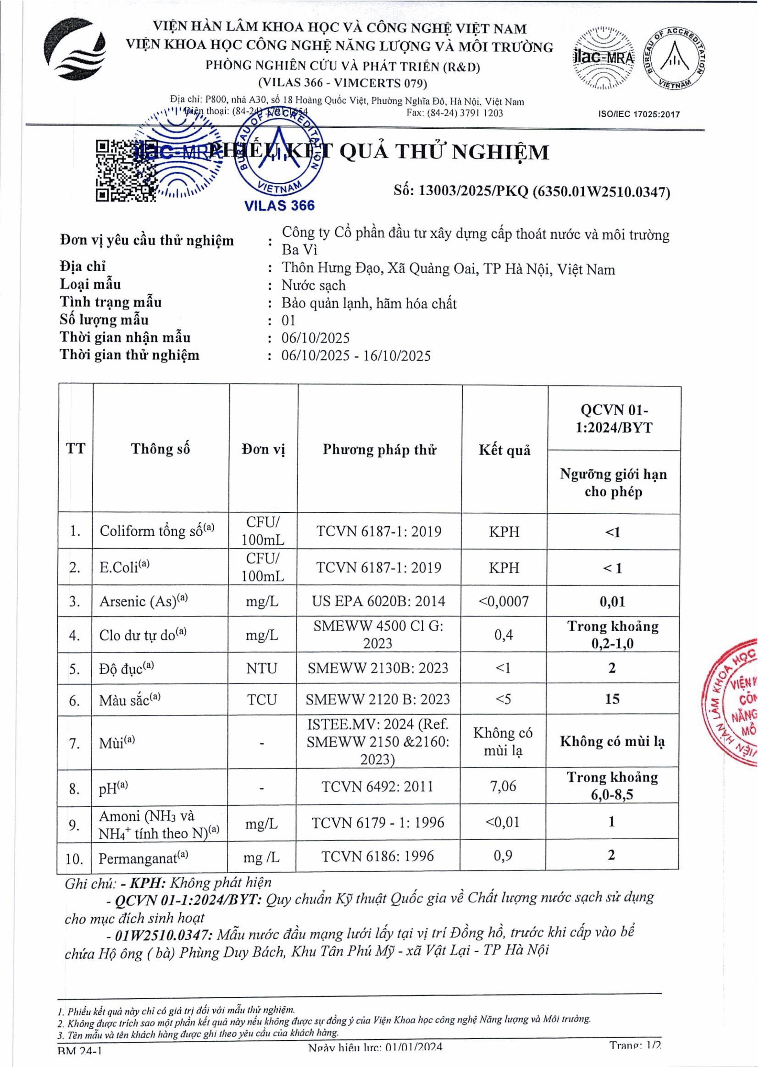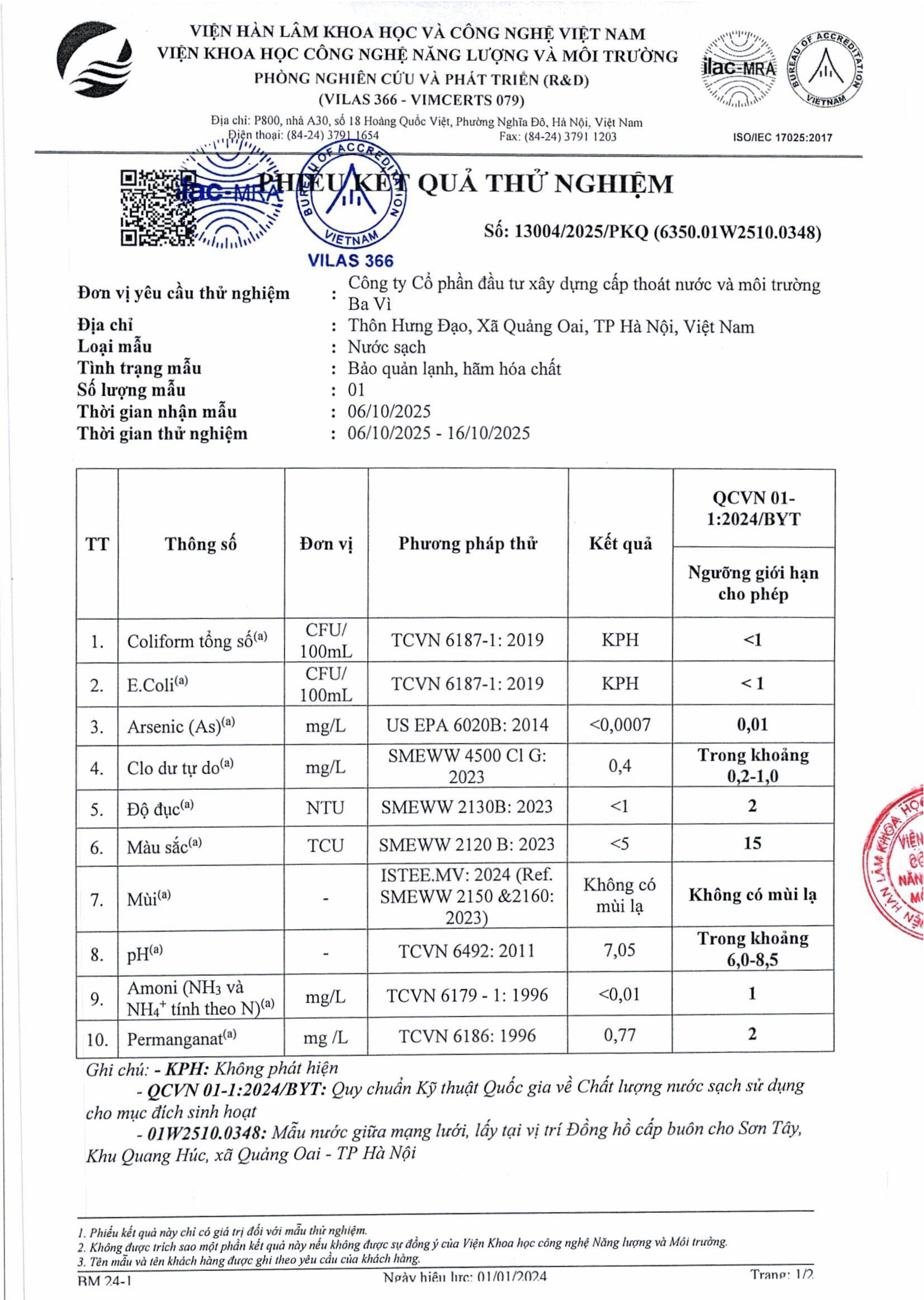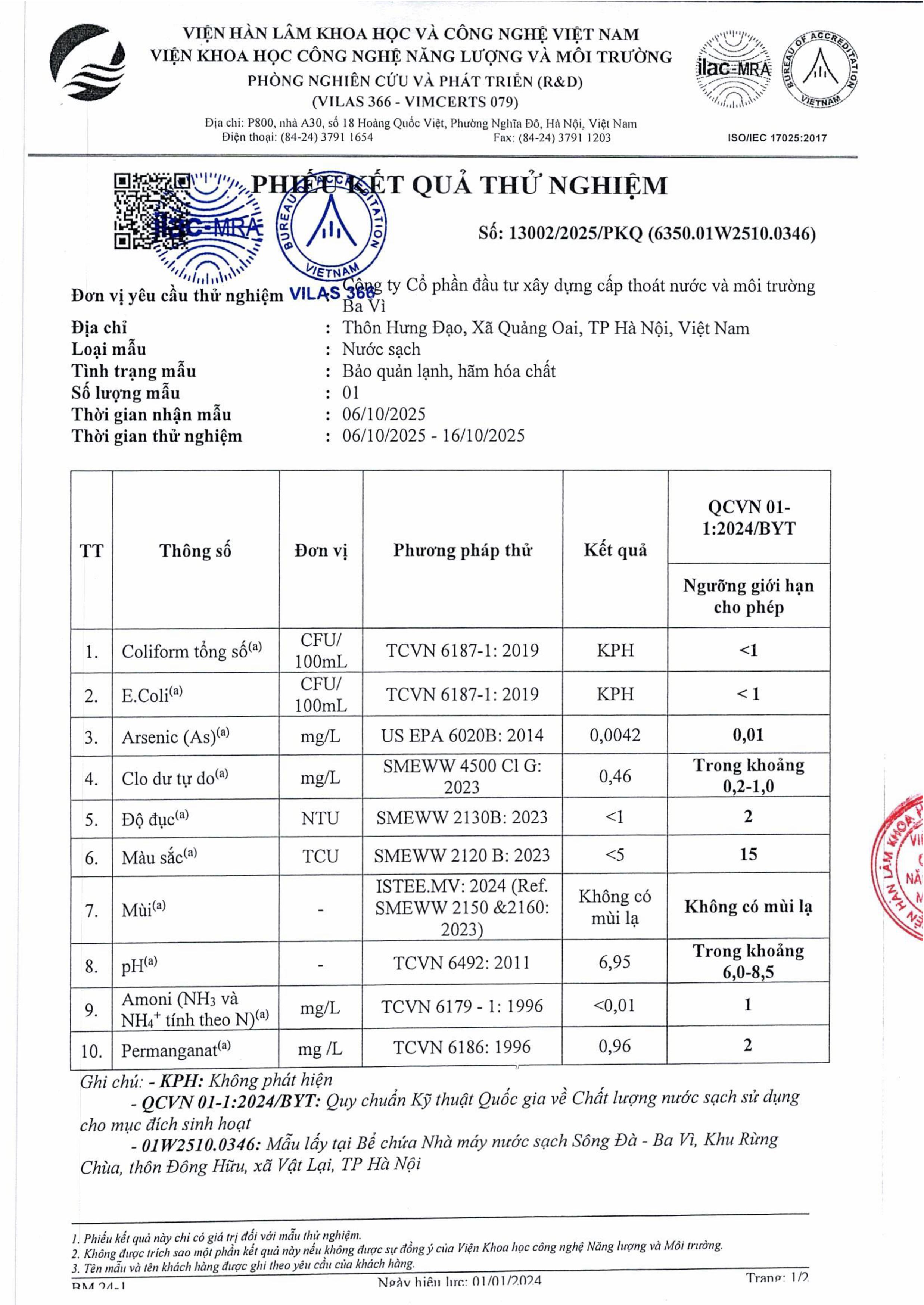 Kết quả thử nghiệm nước Tháng 10