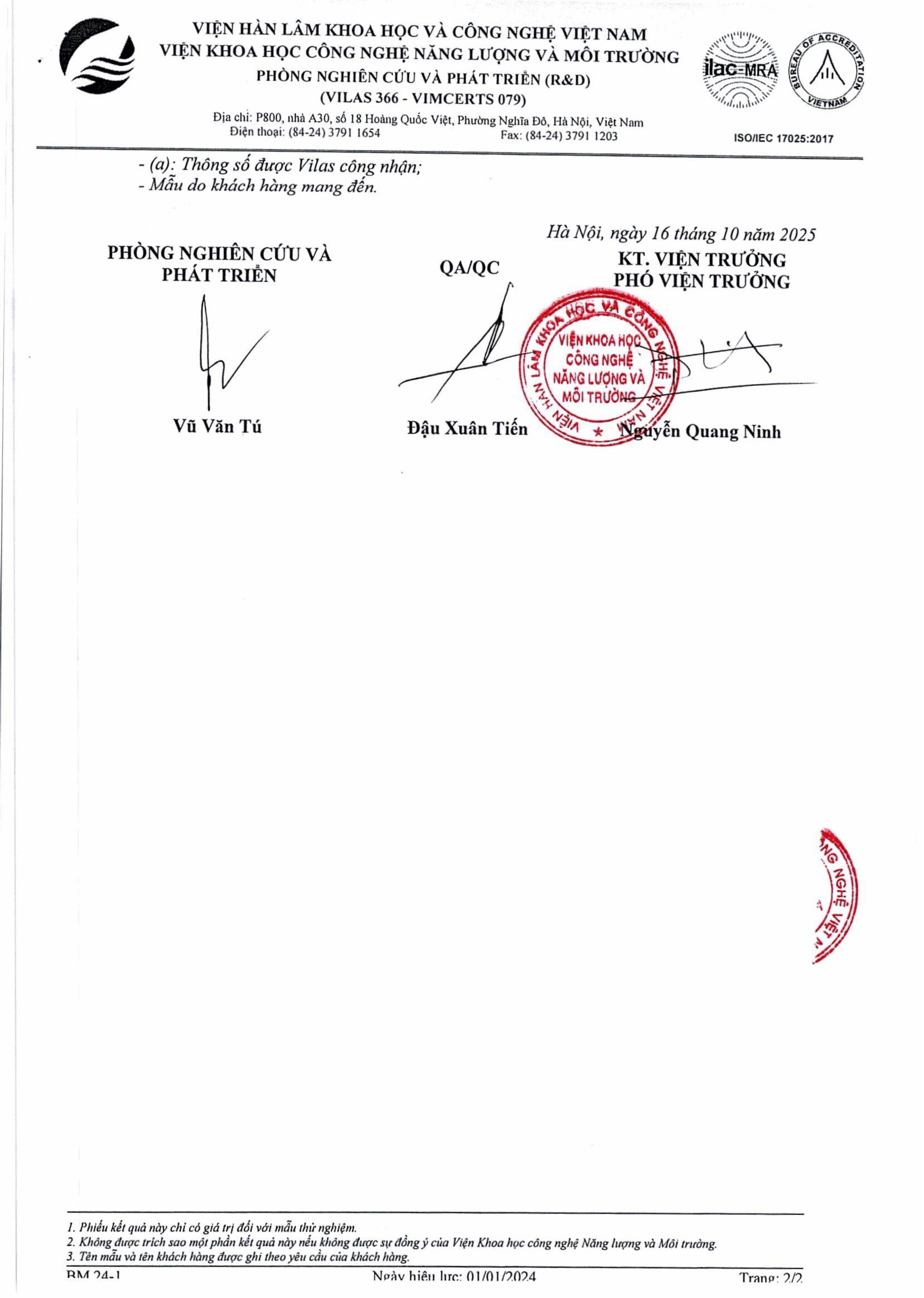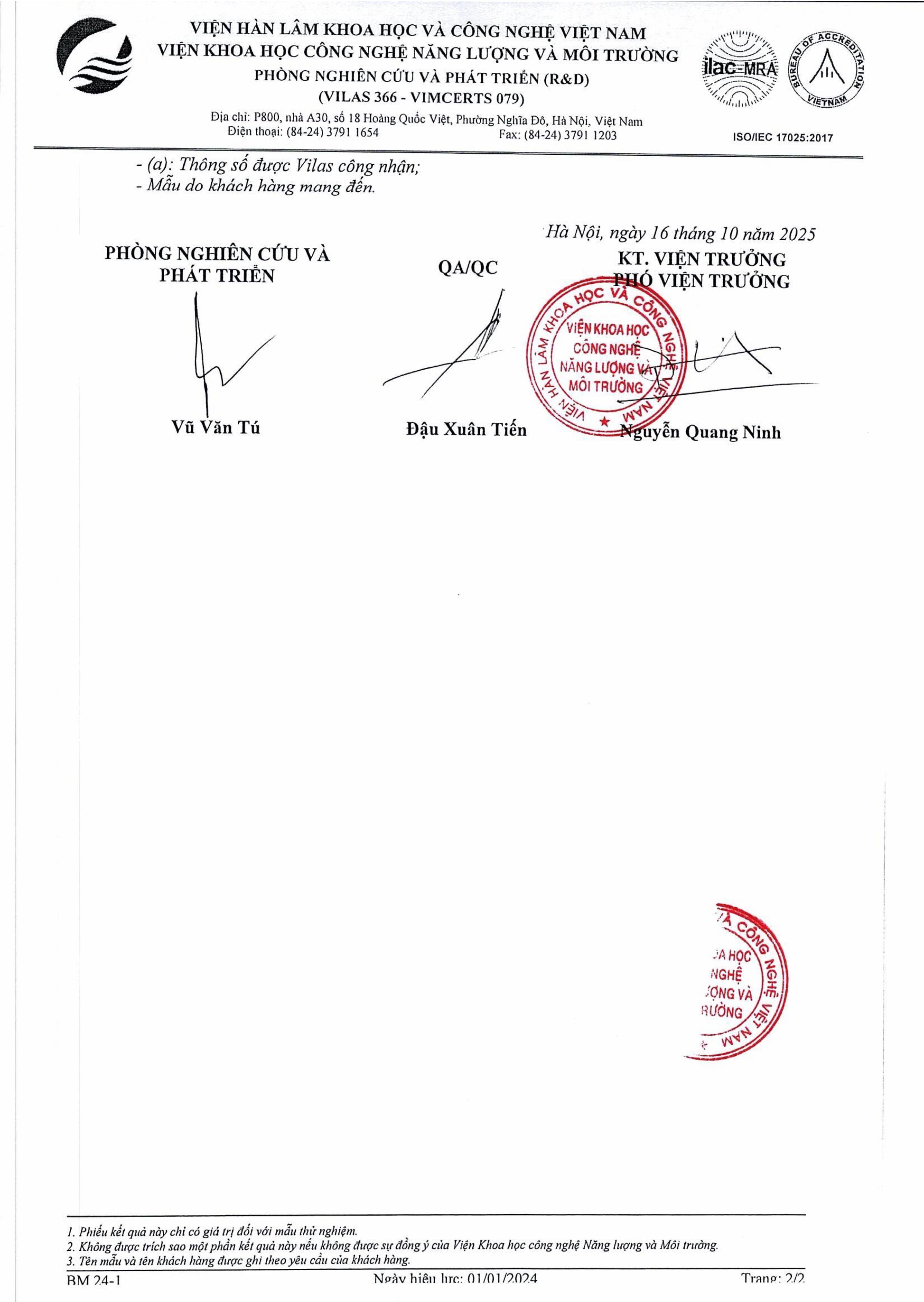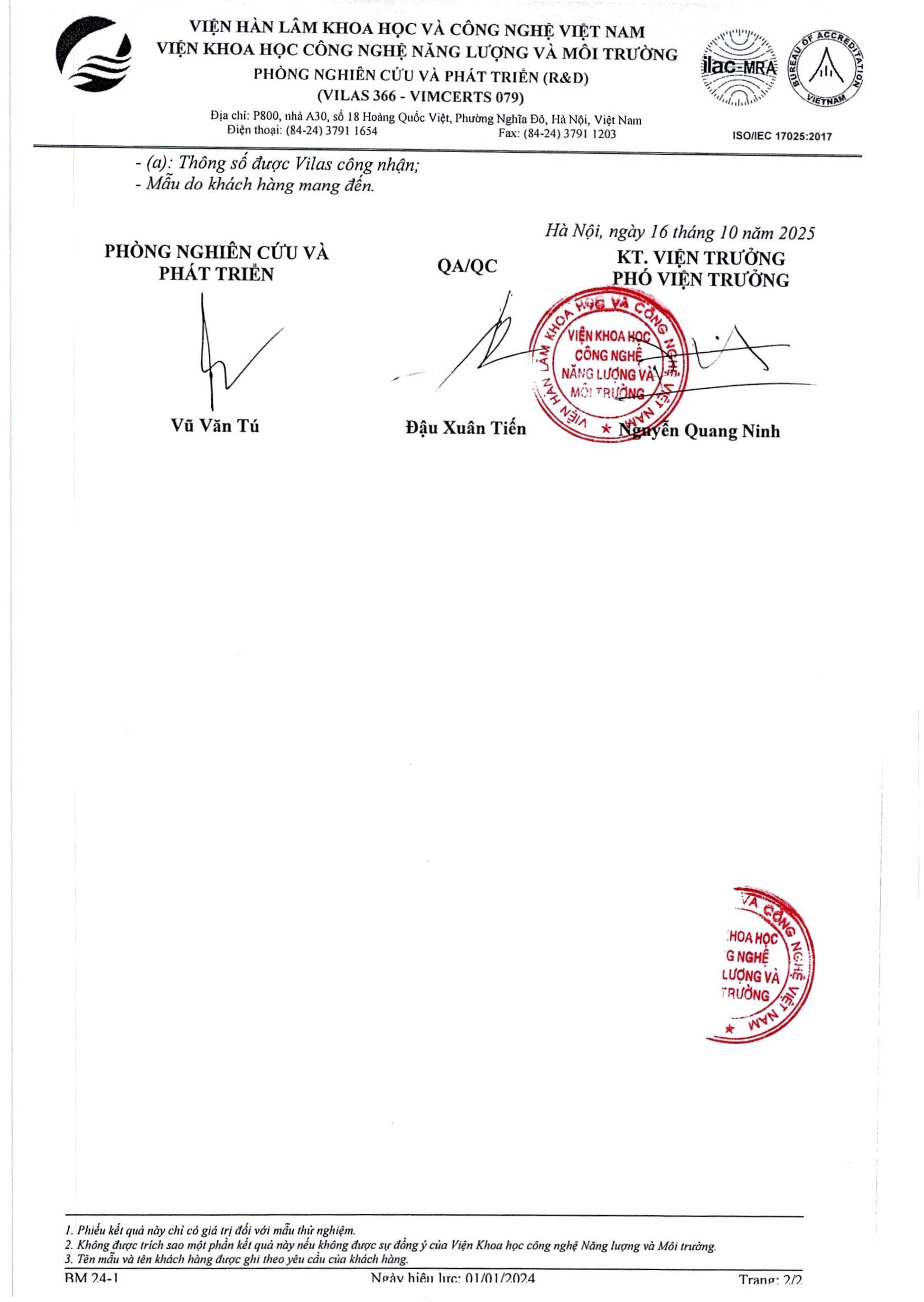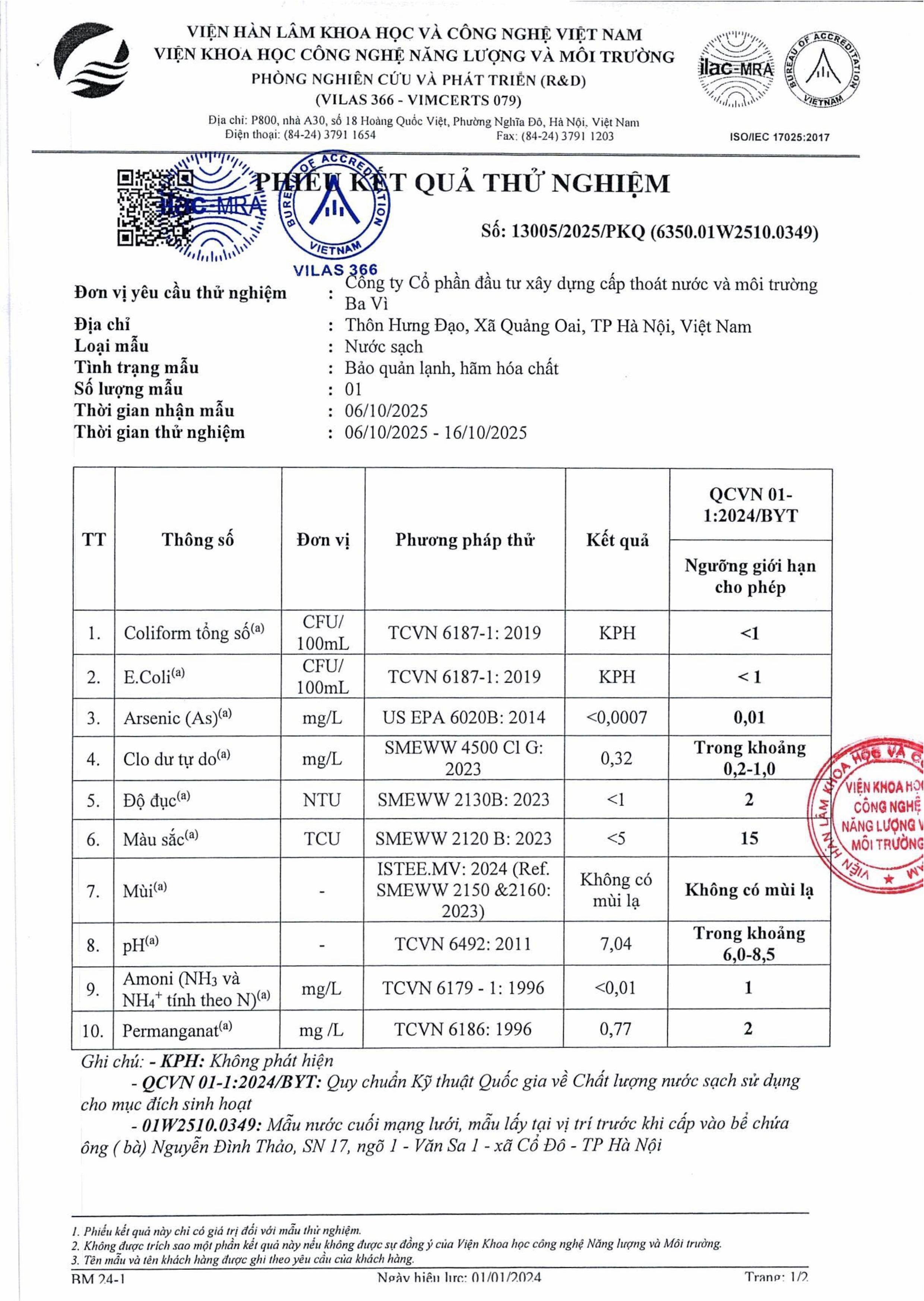 Kết quả thử nghiệm nước Tháng 10